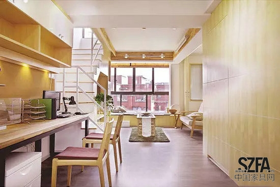 小戶型雙人沙發(fā)背后,便是開放式臥室,當(dāng)折疊門打開時(shí),主人可以很方便地在床上觀看影片。來客時(shí),折疊門一關(guān),臥室風(fēng)光自然遮掩不可見了。