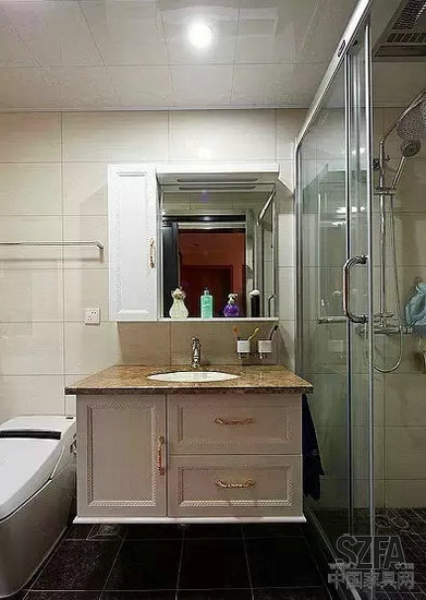 衛(wèi)生間之一,簡歐式的洗手臺(tái)和衛(wèi)浴柜提升了整體格調(diào),充足的柜子保證了小衛(wèi)生間的收納需求。