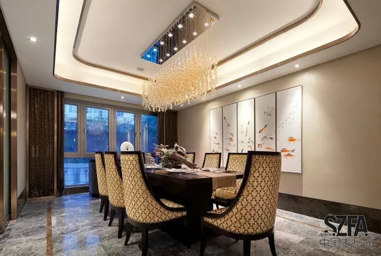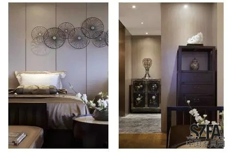 設(shè)計師在軟裝設(shè)計上,取“魚、水”為題,“魚”與“玉”為諧音,“水”則養(yǎng)“玉”呼應(yīng)主題。深褐色調(diào)為主的色彩,中式傳統(tǒng)家具與知名品牌家私,強調(diào)細致與高貴。