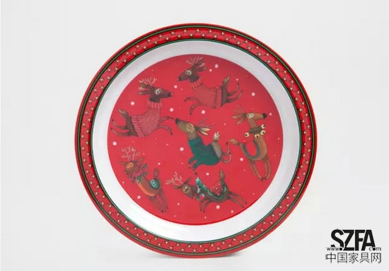 餐盤(pán)上的麋鹿漫畫(huà)更加形象有趣,六只穿著鮮艷服飾的麋鹿或立或跳,表情生動(dòng)。