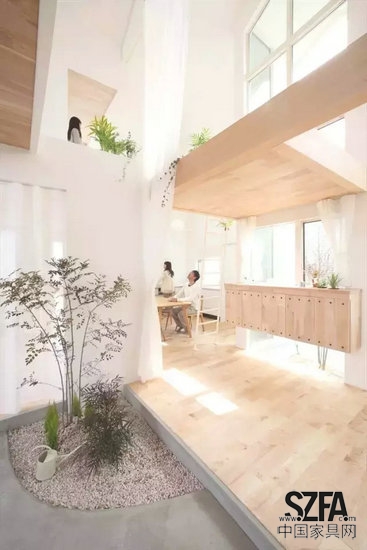 高大的樹(shù)木種植在客廳里,樹(shù)冠通過(guò)天窗延伸到室外,整個(gè)客廳瞬間充滿植物氣息