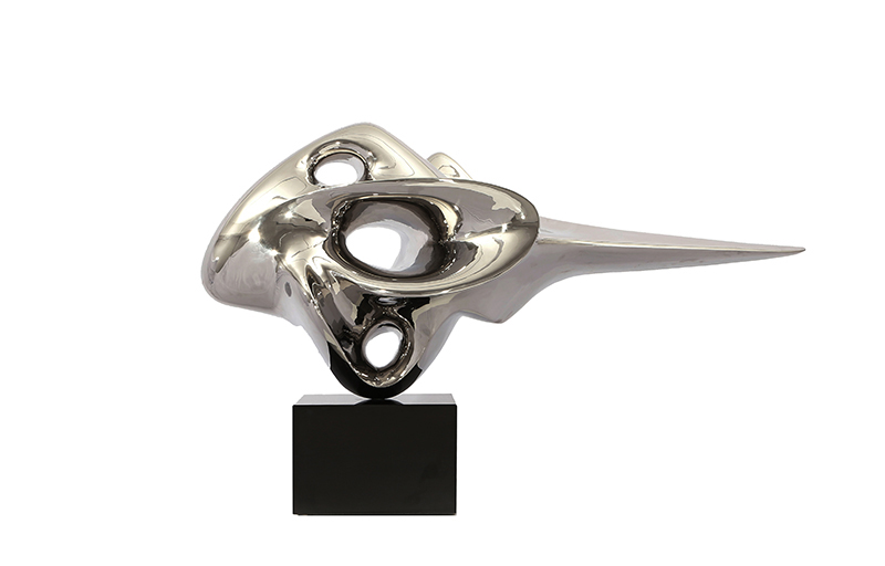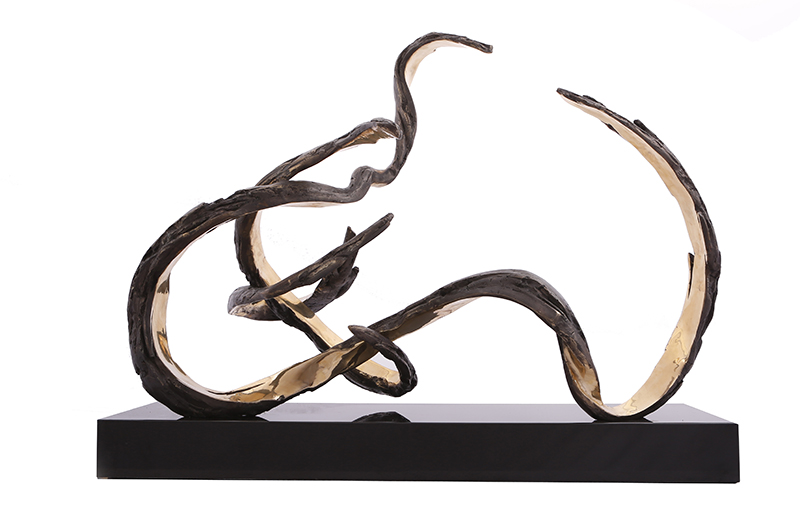 那特墨韻系列,主要包含以墨為主的墨形、墨色、墨韻以及書法等意象。以書法為主的取象、道、勢、韻幾個方面入手,以狂草的意蘊為背景,主取“飛動之勢”、靈性揮灑的特點加以立體的演化,構成突出其形式美的純抽象雕塑和壁飾。它們或粗或細,或澀或潤,或急或緩,或靜或動,或隱或現(xiàn)......金屬線條的肆意流動飛舞卻充滿著張力,有如音樂的境界,時空合一,傳達出生命的意象。