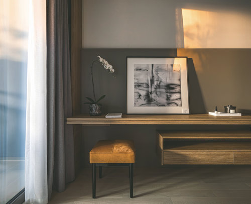 臥室空間考慮到與整體硬裝設(shè)計的結(jié)合,沒有添加過多的裝飾,重點都放在家具自身的顏色和材質(zhì)。琥珀色作為主題色延續(xù)在每一處空間,但又有變化,深深淺淺,點出每一個空間的功能屬性。