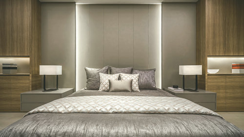 藝術(shù)畫方面以抽象油畫為主,畫面圖案以色塊為主,圖案簡潔,通過畫面的層次感營造空間的延伸,色調(diào)也與整體空間的藍灰色統(tǒng)一,以純粹的線條與顏色體現(xiàn)該戶型神秘、干凈、利落的主題。