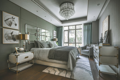 客廳與餐廳的設(shè)計(jì)中,高貴的氣質(zhì)在祖母綠與高級灰結(jié)合的剎那占領(lǐng)整個空間,在溫潤如玉的質(zhì)感與盈透的色澤中,彰顯著無與倫比的誘惑魅力。 她說:我想要讓身處其間的人,在妙曼的視覺感受之后,發(fā)現(xiàn)有某些元素能夠觸碰我們內(nèi)心的原點(diǎn)。配合著極簡的設(shè)計(jì)構(gòu)思,餐廳室內(nèi)空間設(shè)計(jì)在材質(zhì)的鋪陳和搭配上表達(dá)了現(xiàn)代設(shè)計(jì)的特質(zhì),祖母綠的餐具與精致的花藝點(diǎn)綴于餐桌上,使得空間層次分明。聚會廳的空間中,溫潤的黃翡色澤介入,材質(zhì)的混搭與精致的工藝形成一場精心的鋪排,簡潔有力的設(shè)計(jì)語言,抽象的藝術(shù)畫與精致雅趣的飾品在同一空間并置。在聚餐廳,你可見獨(dú)具風(fēng)情的鉚釘元素餐椅,來自歐洲的復(fù)古家具,宛若白流蘇一般的水晶吊燈,圖案獨(dú)特的地毯與精美的花藝,交疊出藝術(shù)的格調(diào)。