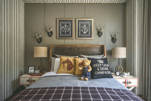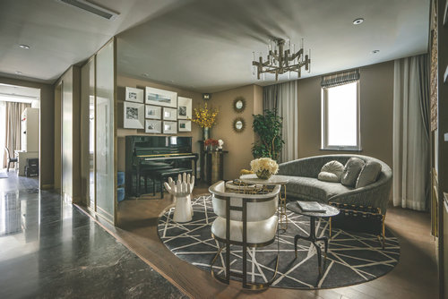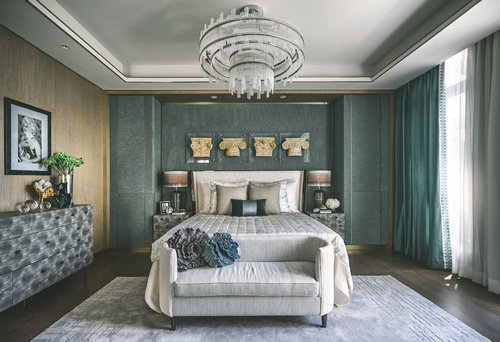 二層、三層為不同主人的臥室空間,均以營造靜謐為前提,用不同程度的灰色糅合現(xiàn)代風(fēng)尚,在內(nèi)斂與品質(zhì)之外,加入異域元素的融入。家庭廳在舒適和藝術(shù)之間達(dá)到共振,圓形沙發(fā)與白色皮質(zhì)單椅的圍合,讓家人相處的時(shí)間融洽自然,墻面掛飾稍作點(diǎn)綴,地毯仿佛一幅裝飾畫,大面積提升空間的裝飾感。主臥休息室主調(diào)為灰色,整體空間莊重內(nèi)斂,銅質(zhì)飾品的介入,形成一脈形成的藝術(shù)感。主臥的設(shè)計(jì)中,設(shè)計(jì)師將古舊粗獷的古羅馬建筑元素提煉成了床頭的藝術(shù)裝置,用精巧的方式將宏大的敘事載入空間,克制的色系與浪漫的表達(dá)形成了東方和西方的對話。次臥用不同程度的灰色糅合現(xiàn)代風(fēng)尚,特殊定制的亞克力床頭和邊柜,空間中的掛畫、飾品以簡潔的形式呈現(xiàn),極致的簡練和輕盈的浪漫并存。男孩房以精致的格紋與幾何線條的延伸界定了空間的格調(diào),歐洲建筑圖案為背景的單椅和精心布置的藝術(shù)品,讓空間更具情景化,純真浪漫。書房中,簡練的色調(diào),奔放的斑馬紋地毯與精致的皮藝形成視覺上的張力,凸顯經(jīng)典與現(xiàn)代的交織感。