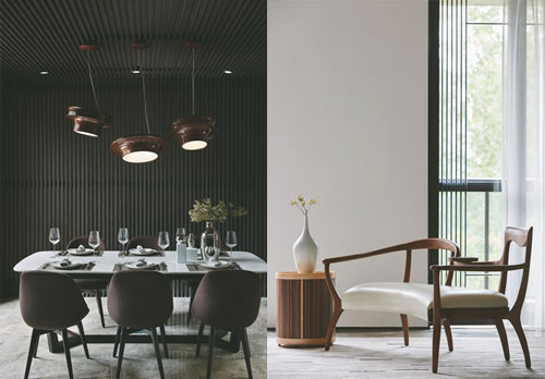 百葉元素由客廳延伸至餐廳,順應(yīng)立面拓展至吊頂。沉穩(wěn)厚重的深咖啡色,搭配色系相近的餐椅,散發(fā)著柔和光澤的吊燈懸于餐桌之上,營(yíng)造出典雅輕松的用餐氛圍。