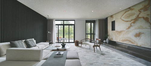 平穩(wěn)式布局體現(xiàn)出客廳的氣勢(shì),陽(yáng)光穿透落地窗,隨意簡(jiǎn)約,盡顯波光靈動(dòng)之美。少許原木色點(diǎn)綴其中,簡(jiǎn)約中富含無窮韻味,營(yíng)造出低調(diào)、靜雅的氛圍。大面積百葉元素呈現(xiàn)一種秩序美,同時(shí)又連貫餐廳、庭院、臥室。沙發(fā)靈活多變,可滿足多元化的使用需求。入座沙發(fā),大理石背景墻映入眼簾,其華美天然的紋理宛如一幅水墨畫。