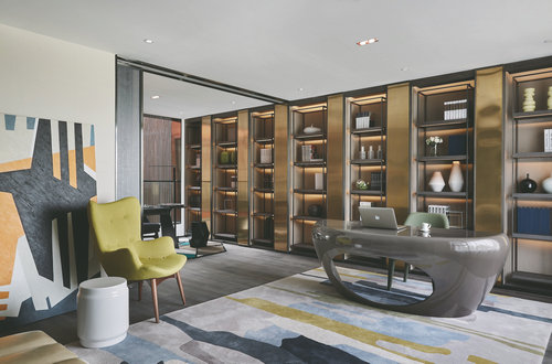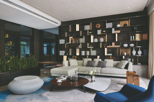 地下一層家庭室,綠植將整個(gè)空間動(dòng)線劃分為通道及活動(dòng)區(qū)。藍(lán)色家私及古銅質(zhì)感書架相映成趣,彼此穿透,給空間賦予雅致、輕松的色彩?;顒?dòng)區(qū)書架采用金屬?zèng)_孔板和發(fā)光體,清晰明快的線條增添整體視覺沖擊力。