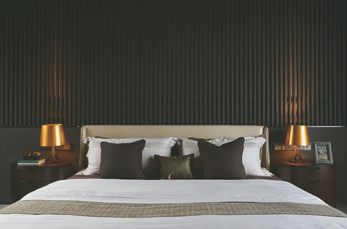 主臥立面及吊頂?shù)陌偃~元素與客廳餐廳立面和諧統(tǒng)一。水墨紋路地毯與自然光線融合,產(chǎn)生極富韻律的光影效果,令空間低調(diào)、怡心。在賦予空間沉穩(wěn)大氣的同時(shí),現(xiàn)代人追求的舒適靜謐也在這里得到滿足。