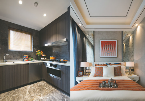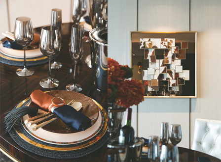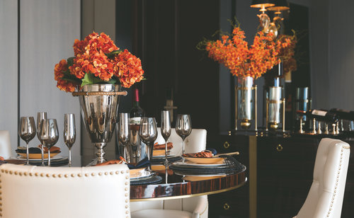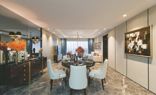 客廳及餐廳方正大氣,超豪華大面寬保證了充足的采光與景觀視野面。在一個(gè)手工羊毛地毯的裝飾下變得生動(dòng)起來(lái),別致的主題元素圖案,橙色和白色的家具搭配具有視覺(jué)沖擊力,整體視覺(jué)效果帶有一種戲劇性的色彩。餐廳高光黑檀餐桌金屬鑲邊貴氣且與餐椅的鉚釘相呼應(yīng)。高腳餐邊柜讓空間更通透又能起到防潮作用。精美的裝飾品,糅合出平衡典雅的用餐氛圍。