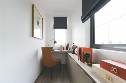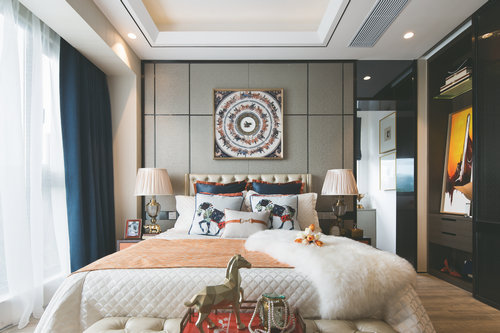 主臥套房設(shè)計(jì),沉穩(wěn)溫潤(rùn)的灰色軟包背景墻搭配清新活力的經(jīng)典掛畫(huà),藝術(shù)感十足。舒適高端的定制床品布藝,分割合理的衣柜。讓居者身臨其境的感受奢華魅力。書(shū)房所處位置非常安靜。在這個(gè)小小區(qū)域,一切都深思熟慮以求潔凈雅致。一幅裝飾畫(huà)打破大塊白墻面的單調(diào)感,整墻矮柜收納設(shè)計(jì),讓自然光線(xiàn)充滿(mǎn)室內(nèi)。主人可在此享受午后閱讀時(shí)光或是小憩一下。次臥床頭背景墻巧用侵花玻璃,從視覺(jué)上增大空間感。軟、硬裝的配合,搭配出自然美觀的空間。